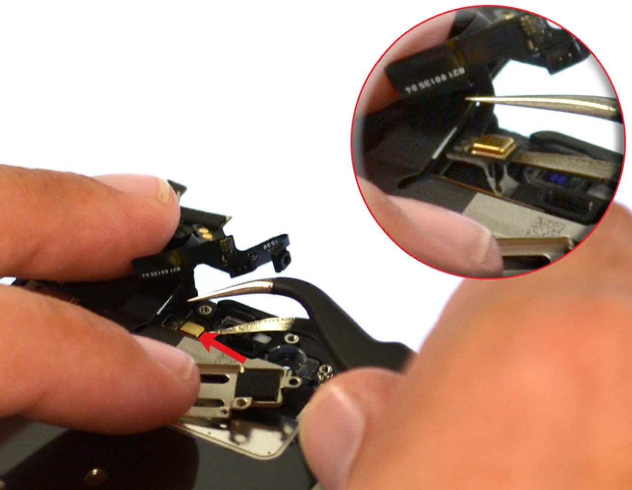 Vérifiez que la nappe Facetime est correctement branchée Si vous avez acheté un écran complet, remplacez votre écouteur de l’oreille et votre nappe facetime par vos éléments d’origine.